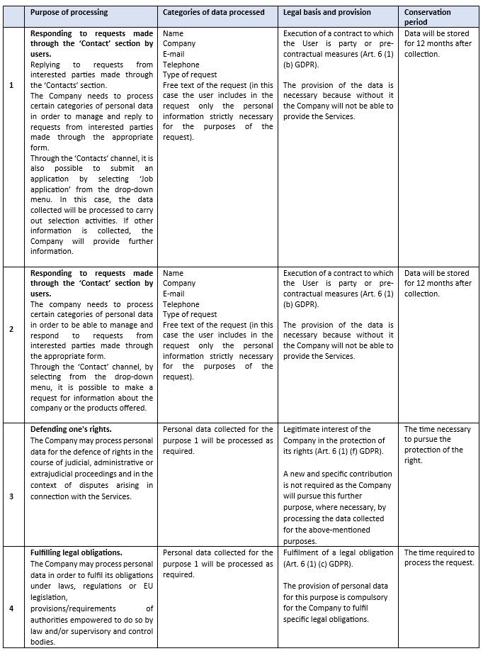 Through the Website and the Company collects some personal data referring to the Users, voluntarily provided by them or collected in the normal operation of the same, which are processed for the purposes described below.